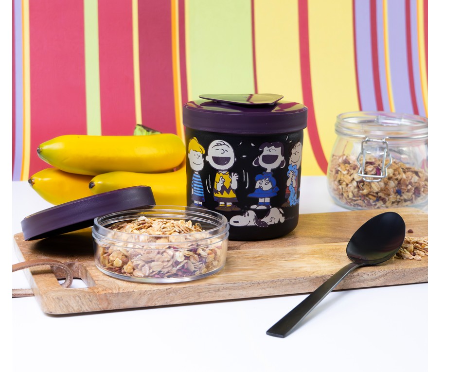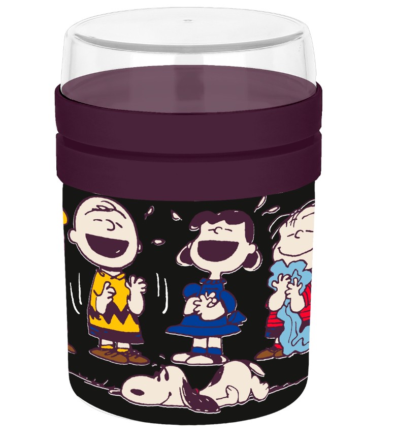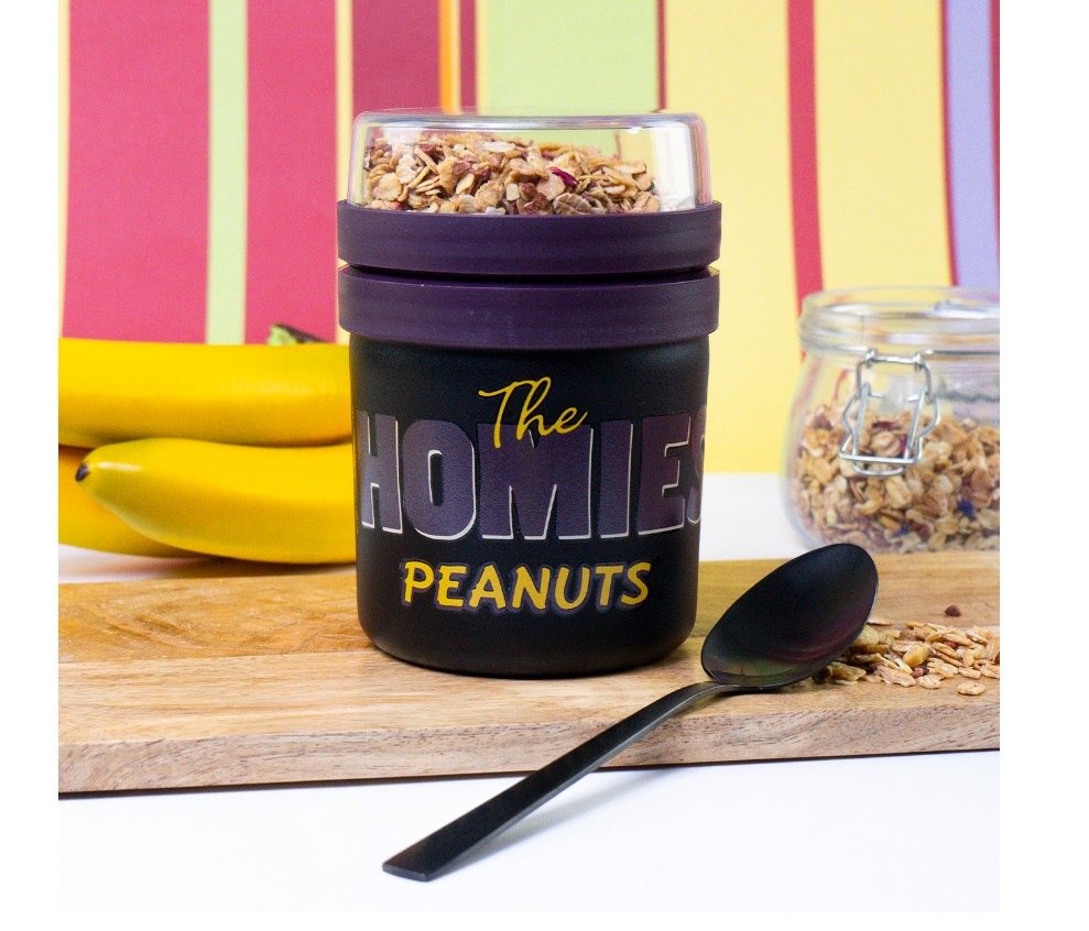 Mit dem Food to go Becher Peanuts Friendship & Wisdom kannst du ganz entspannt dein Müsli Unterwegs genießen, ohne dass deine Zerealien matschig werden. In den beiden Kammern kannst du trockene Zutaten von Flüssigkeiten getrennt voneinander transportieren und kurz vor dem Genuss frisch zusammenmischen. Im großen Becher kannst du ganz praktisch dein Porridge direkt in der Mikrowelle erwärmen! Alternativ gehen auch Suppen und andere heiße Gerichte. Mit dem praktischen Bajonettverschluss können Deckel und Becher durch eine einfache Drehbewegung zusammengesteckt werden. Wer mag transportiert darin alternativ auch seinen Salat oder Gemüsesticks mit einem leckeren Dip. Der klare Deckel bietet mit seinen 150ml ausreichend Platz für Toppings oder Dressings und im Becher ist mit 500ml genügend Platz für deinen Joghurt, Salat oder Obst.