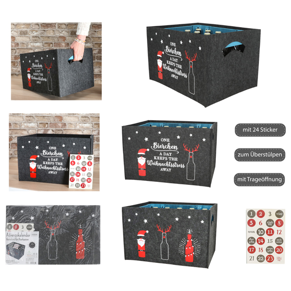 Das Adventskalender-Set besteht aus einer weihnachtlichen Filz-Banderole für den Bierkasten und Aufklebern mit Adventskalenderzahlen von 1 bis 24 für die Kronkorken. Für eine unkomplizierte Befestigung ist ein Klettverschluss an der Banderole angebracht, die super um normale Bierkästen mit den Standardmaßen 40 x 30 cm passt. Ob es dann ein Adventskalender mit 24 x 0,33 l-Flaschen oder 20 x 0,5 l-Flaschen wird, ist jedem selbst überlassen.