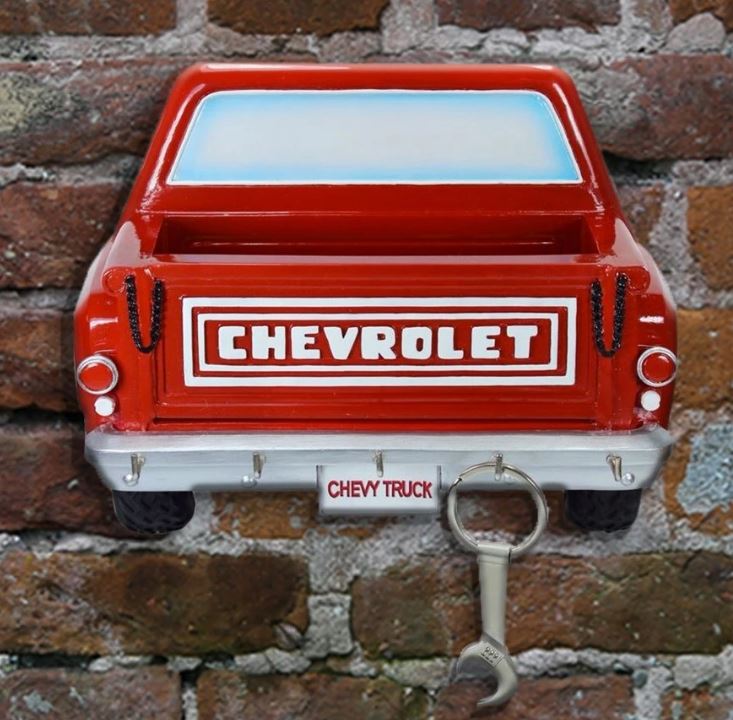 Für jeden Oldtimer Liebhaber / Besitzer ein Muss ! Damit die Schlüsselsuche aufhört, ein Schlüsselbrett für den Eingangsbereich oder die Garage das ultimative GM Chevrolet Stepside Pick up Schlüsselbrett mit Brieffach ! - Farbe Rot Maße: Länge ca. 19,5 cm Höhe ca. 10,5 cm Tiefe ca. 7 cm Mit 4 Haken zum Schlüssel anhängen, sowie Brieffach Material: Resin