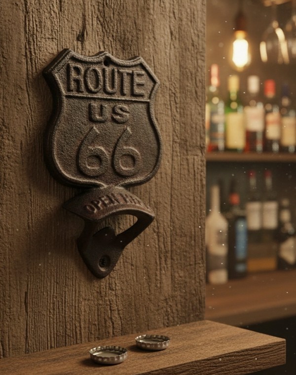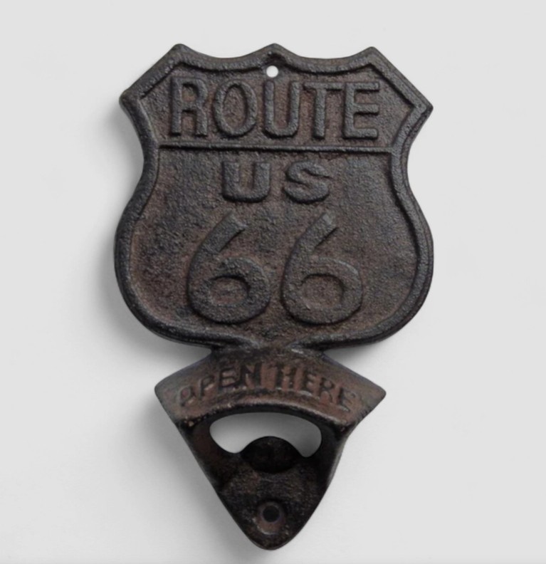 Mit aufwendigen Details und einer verwitterten Oberfläche bringt unser Route 66 Flaschenöffner einen authentischen Hauch von Amerika in jeden Raum.